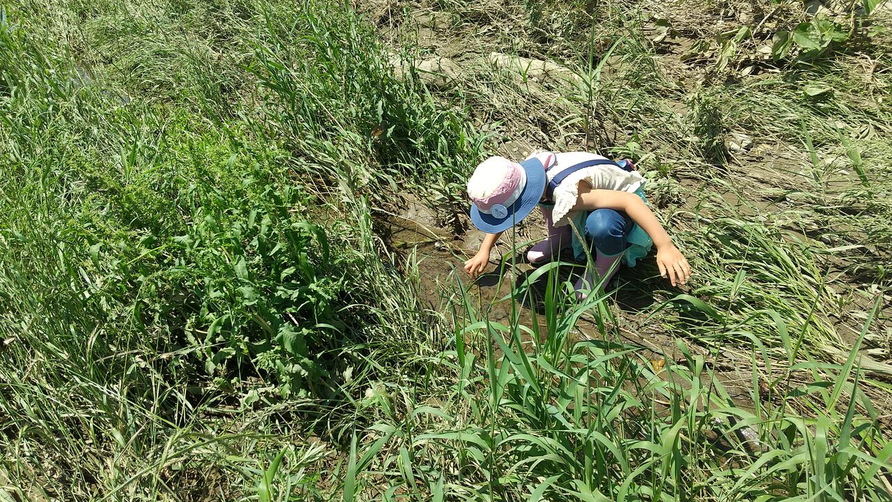 細い水路に増水から避難したものの取り残されたような生き物がたくさんいました。