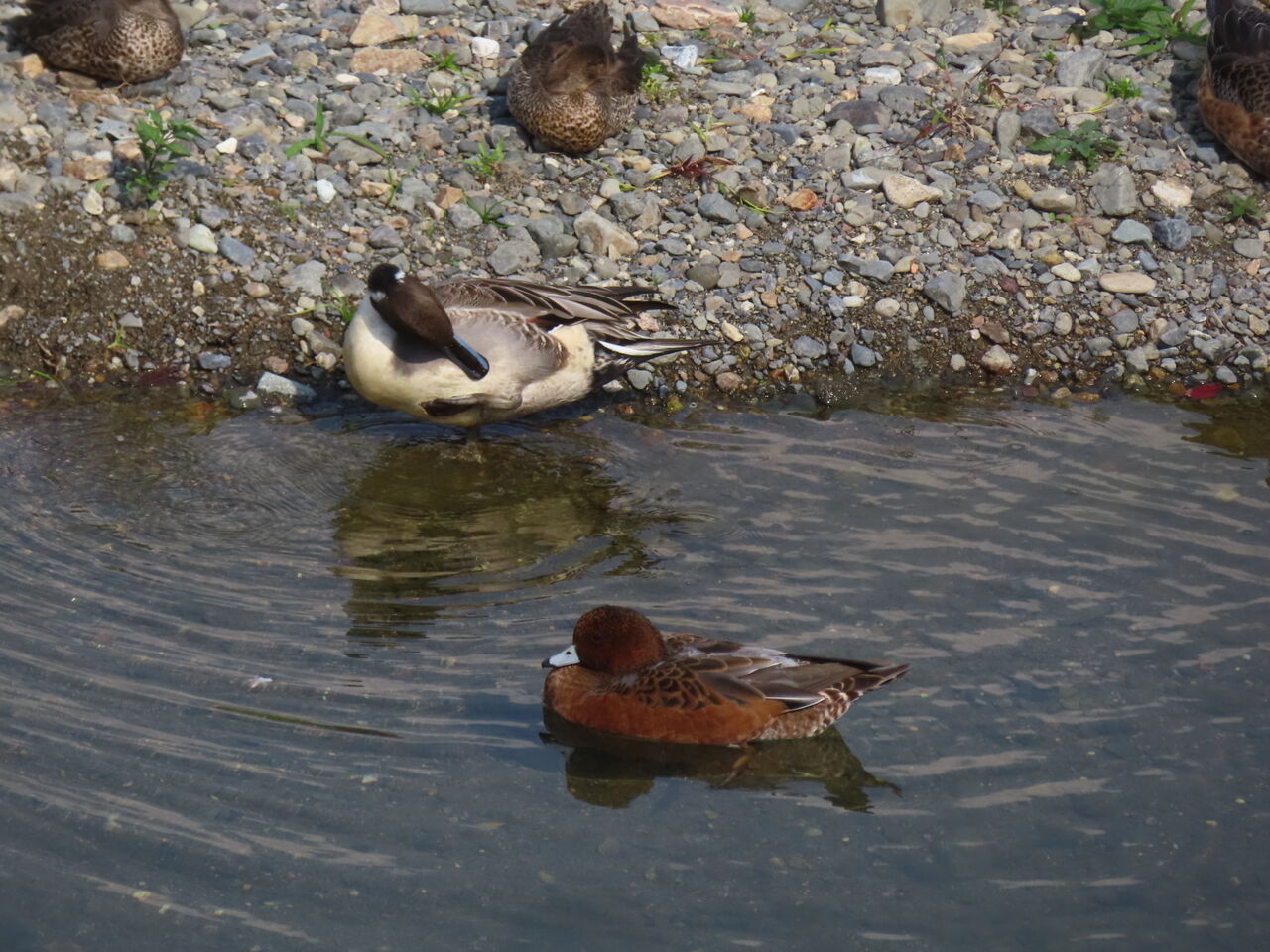 2023年10月27日 10月27日鳥類調査隊報告 今日の鳥類調査隊は5名が参加。冬鳥が続々と到着しています。手前から、ヒドリガモ、オナガガモ、コガモ。ヒドリガモはオスの非繁殖羽です。首の後ろにうっすらオスの羽根が見えています。タシギコサギが追い立ててくれたので見つけられました。ジョウビタキ数日前に今季初めてみたと思っていたら、あちこちでナワバリ争いを見るようになりました。タコノアシ赤く色付き、ずいぶんタコの足っぽくなってきました。次回は11月28日(火)10時~です。
